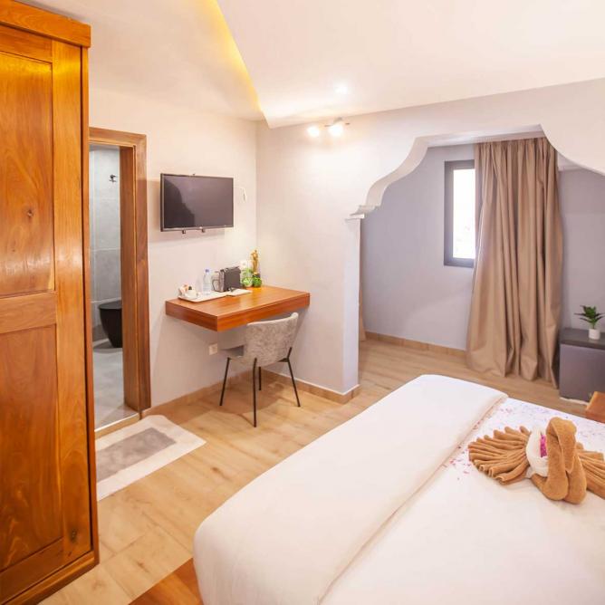 Notre hôtel "Les Flamboyants 3*" est situé sur la "Petite Côte du Sénégal" au coeur même de la station balnéaire de SALY PORTUDAL gorgée de soleil toute l'année, et à environ 5 heures d'avion de la France. Cet emplacement idéal, lui procure une proximité à toute vos envies. Toute nos équipes n’ont qu'un seul objectif, faire de votre séjour un moment agréable, unique et inoubliable.